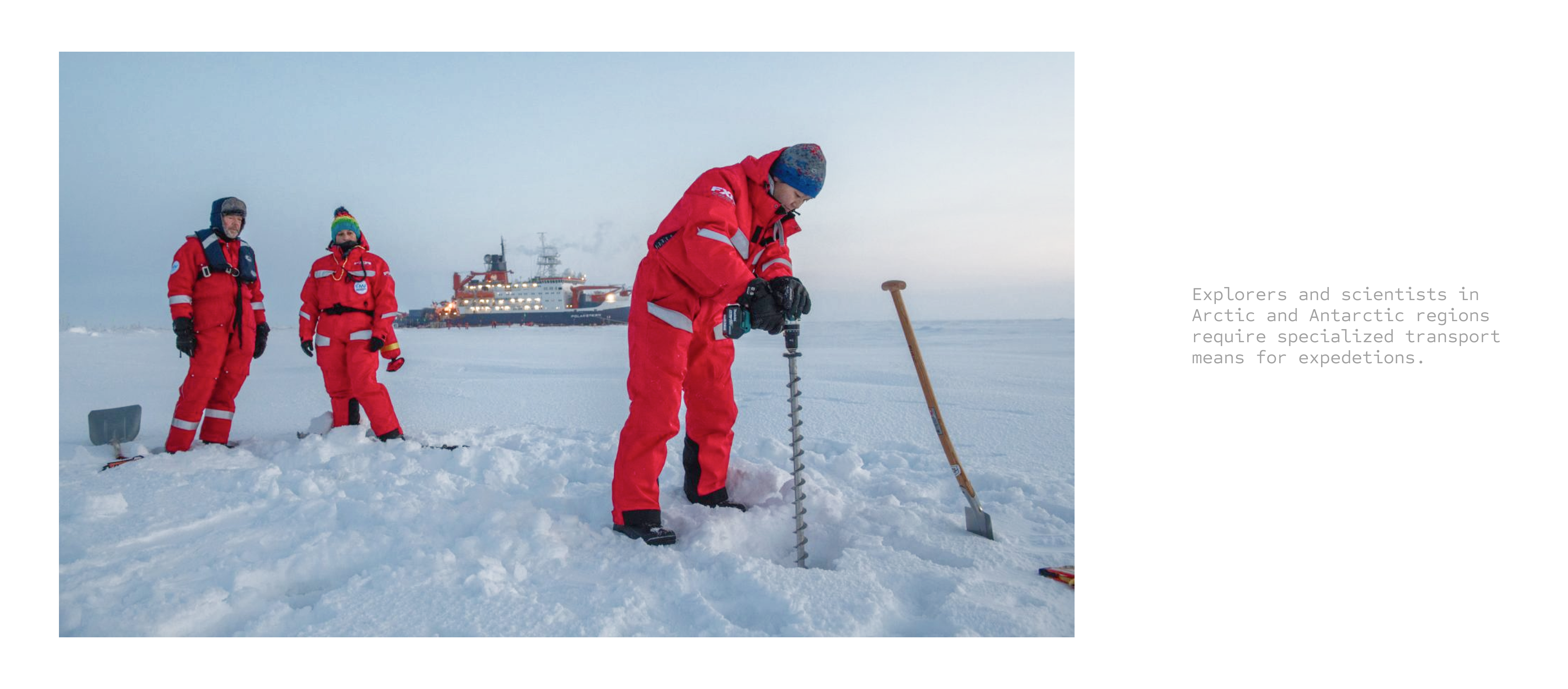 A modernized personal expedition vehicle intended for scientists and explorers for commuting in polar regions with special features and tech adaptations that ensures the difficult polar conditions have little effect on the vehicle.